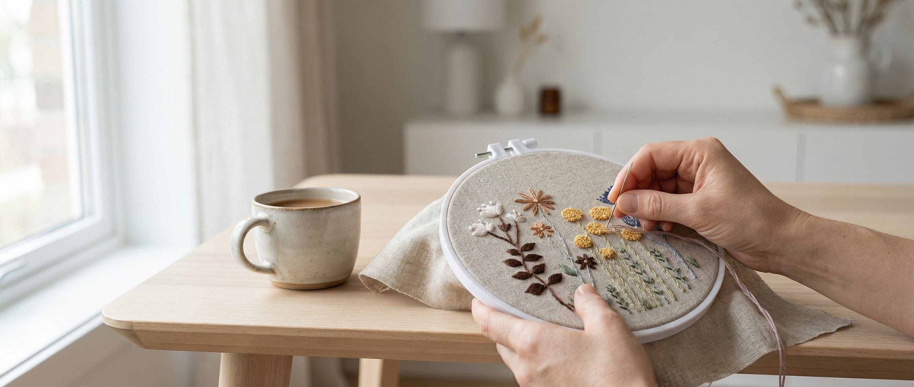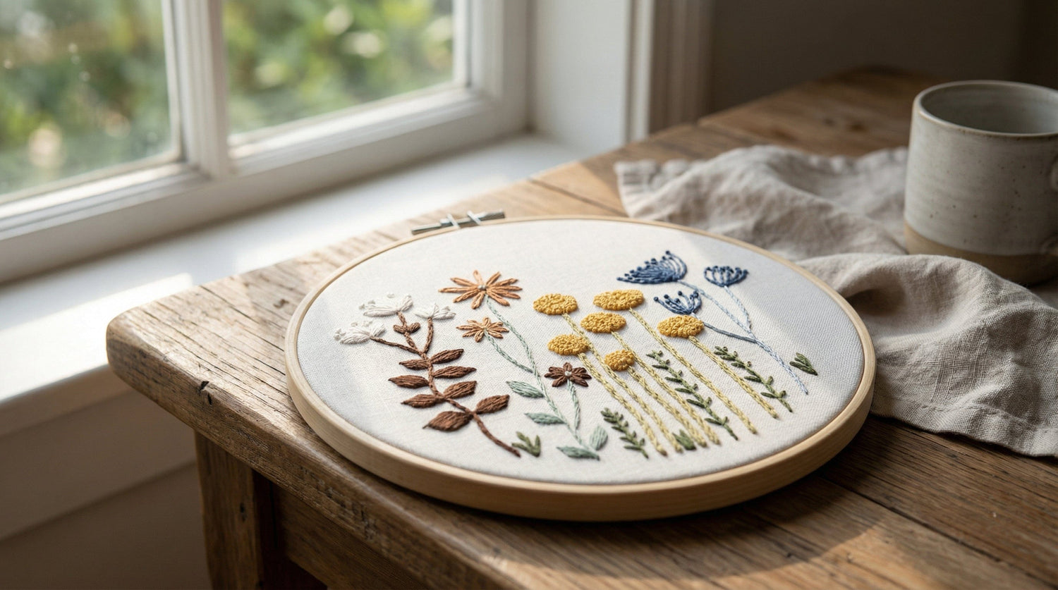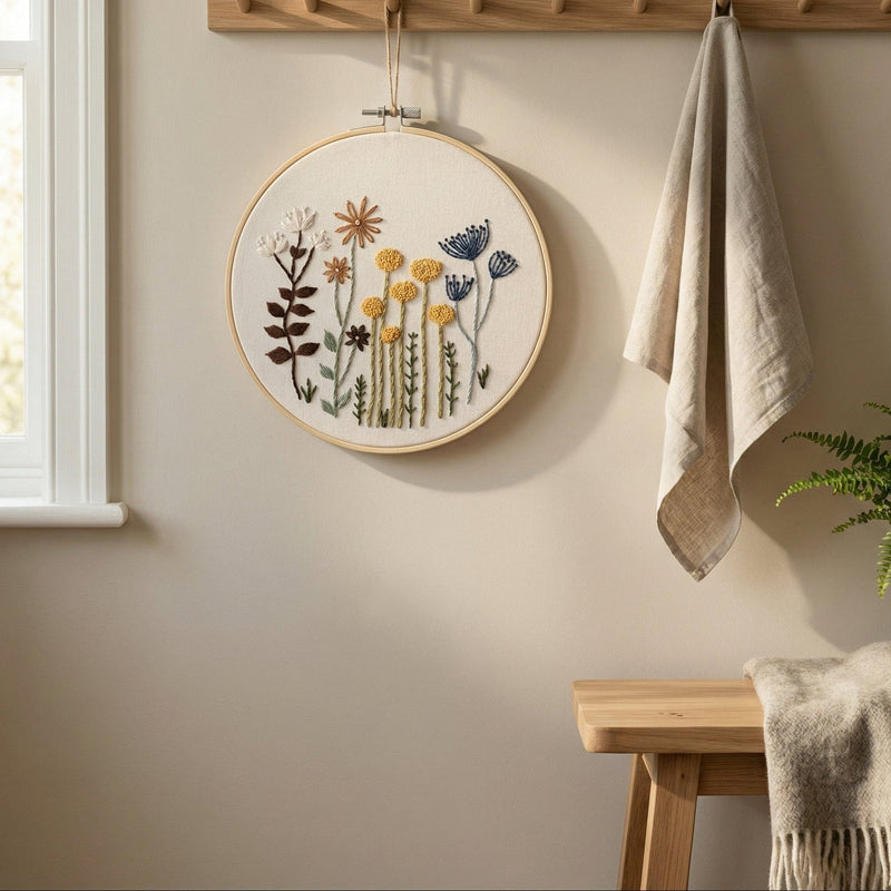 Genom enkel brodering växer ett mjukt blommotiv fram — ett objekt som inte bara skapas, utan får ta plats i ditt hem.