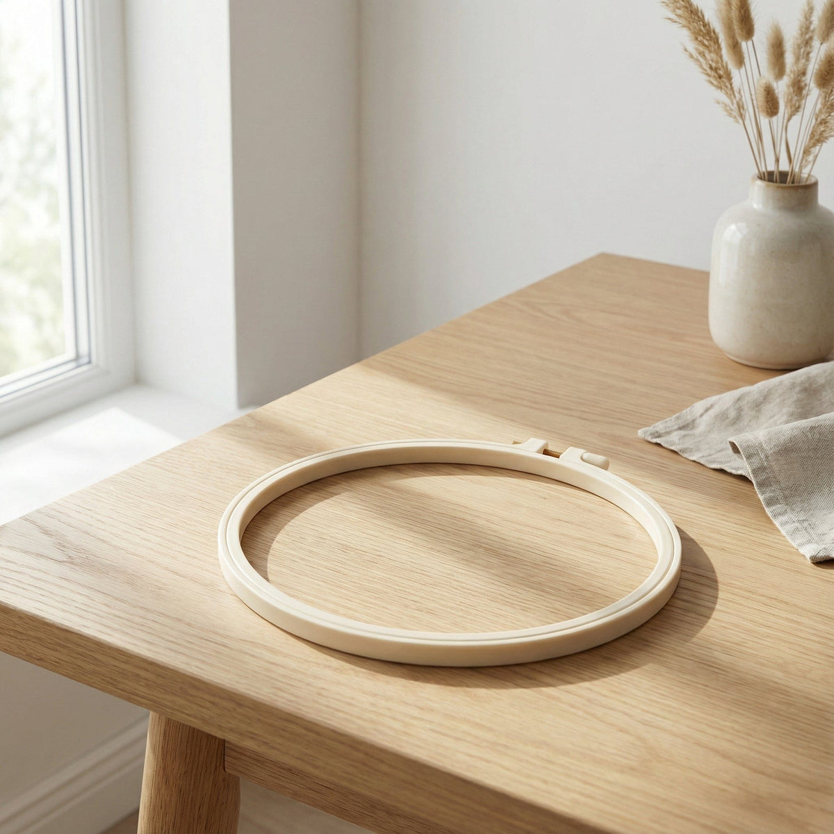 En broderad väggdekoration i naturligt trä, skapad för långsamt skapande och ett hem med känsla.